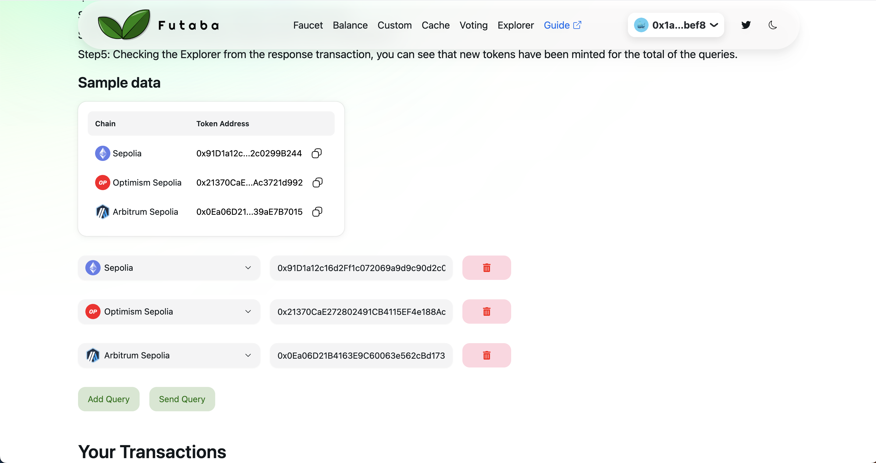 The only tokens that can be queried are those received from [Faucet](https://demo.futaba.dev/faucet). If you wish to query any ERC20 token, use [custom-query](https://futaba.gitbook.io/docs/guide/futaba-testnet/custom-query "mention").